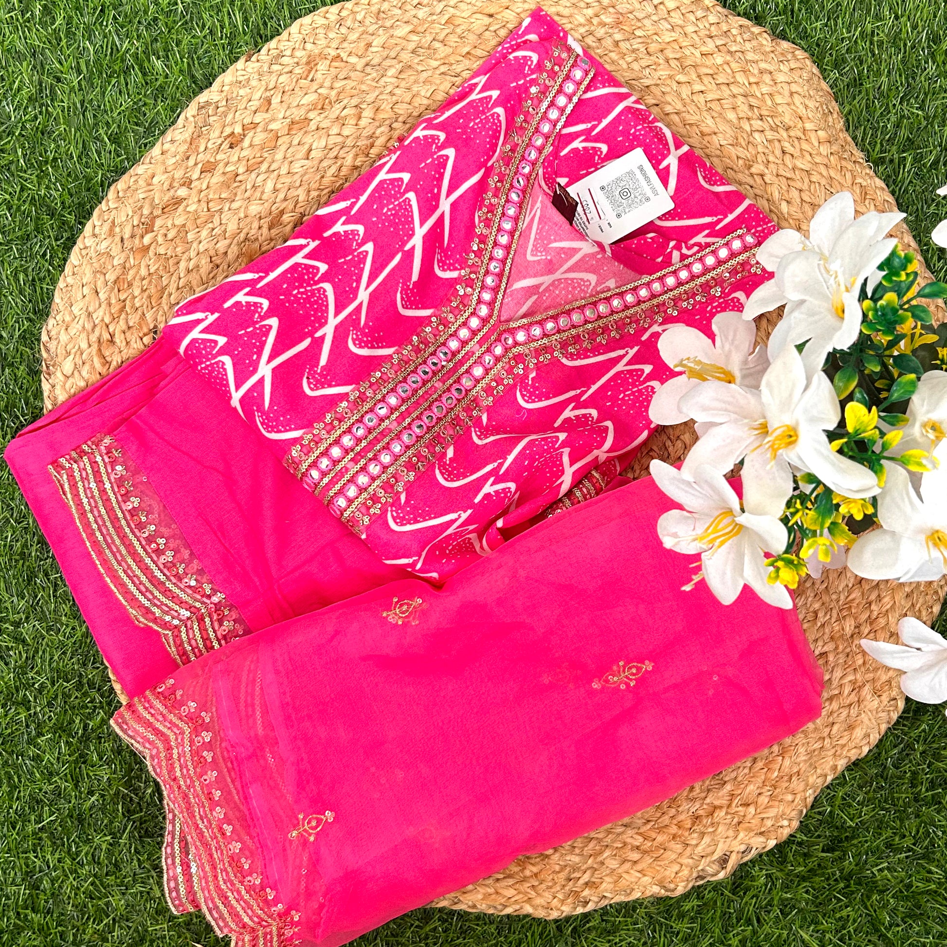 Design: Traditional Bandhani Print with a sheer Organza Dupatta