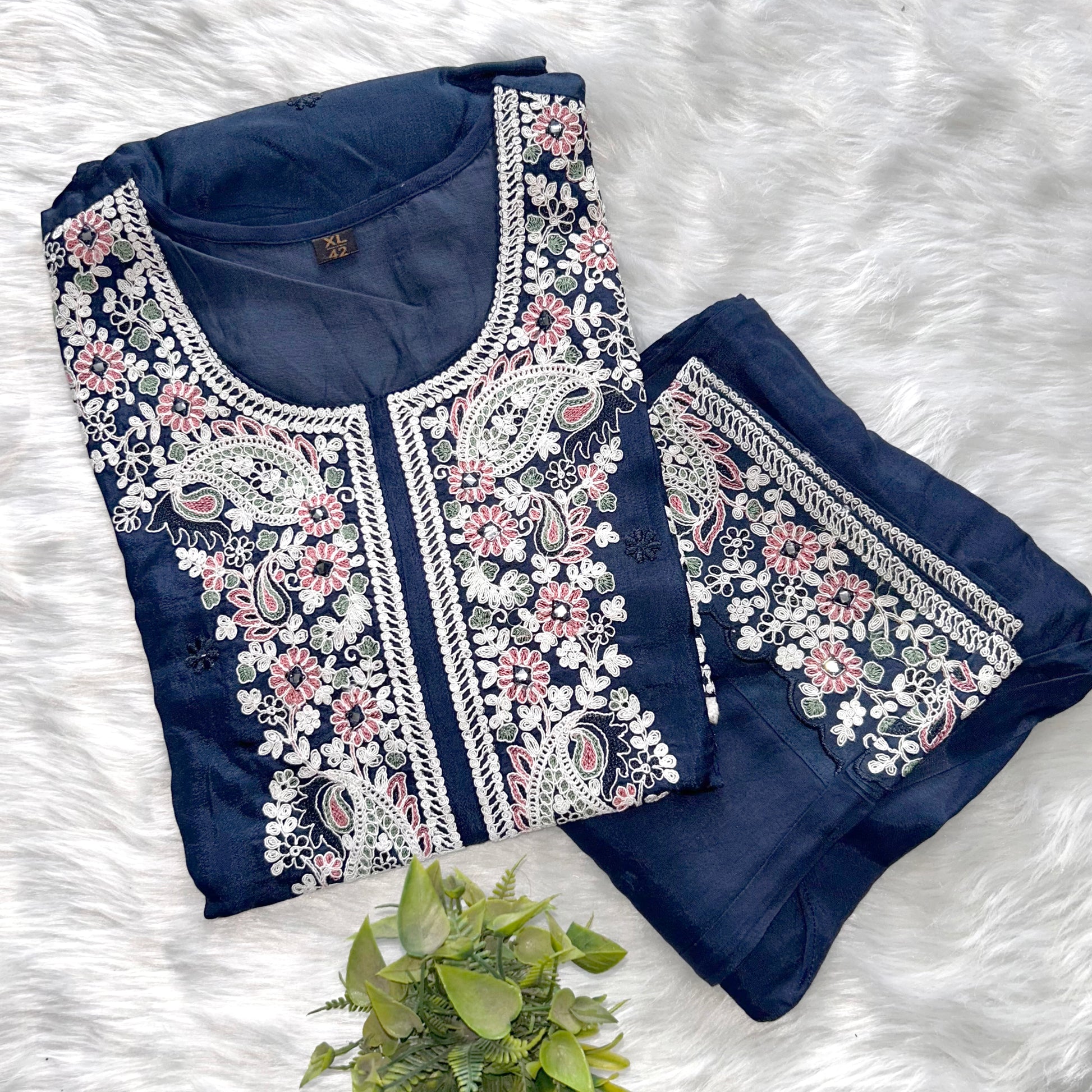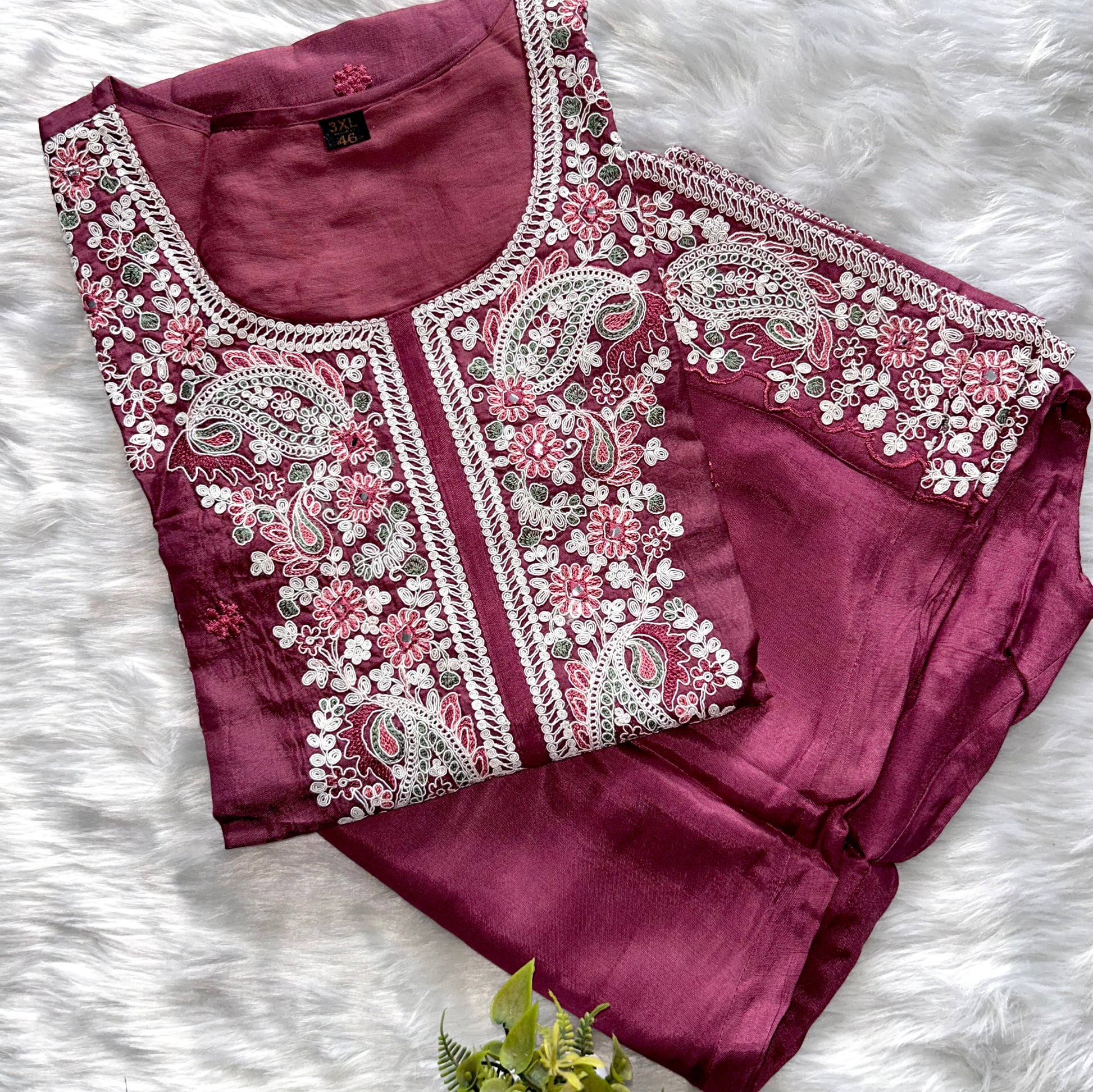 Pure Russian Silk with Heavy Embroidery offers a natural sheen, rich drape, and luxurious finish, making this suit set a timeless addition to any premium wardrobe.